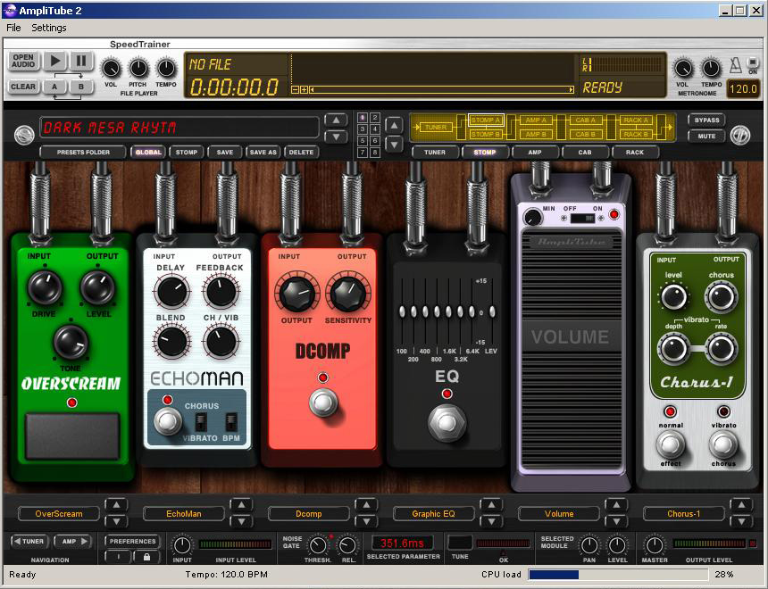 - 5 separate modules: tuner, configurable Stomp pedal board, Amp head, Cabinet + Mic, and Rack Effects