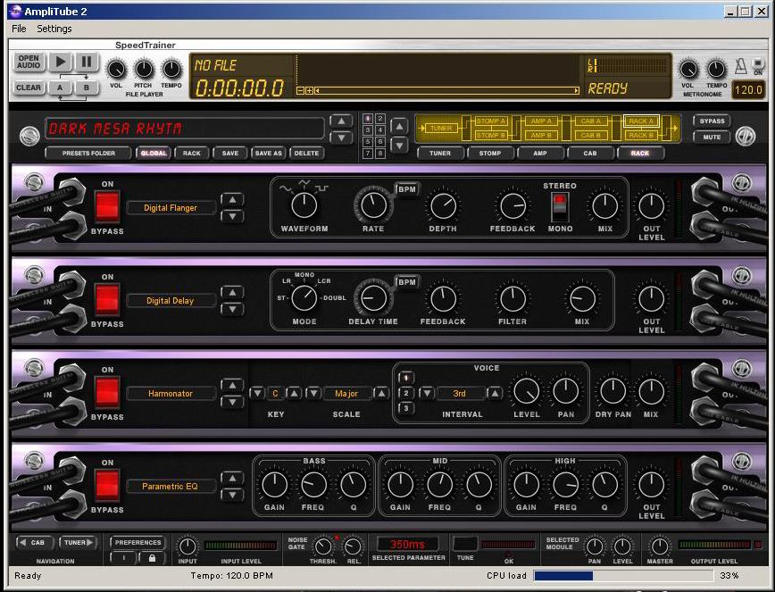 I also ended up using the software for sounds on quite a few of my own collaborations when I didn't have amps handy and/or didn't want to use what was on site. AmpliTube 2 worked admirably on everything, from jazz to death metal, both for guitars and bass. There were enough sounds on tap and with the right amount of tweaking and I was able to create a convincing tone. In some cases I felt that the layout was too rigid - for example I wanted to use some of the rack effects in the chain before the preamp and in other cases I wanted to use some of the stomp boxes after the amp (as in fx loop) but the software didn't allow me to do that. I felt that I'd like to have more than one noise gate, or at least the option to place them in different locations as it is in real life. I managed to use some external fx pedals such as overdrive, eq and compressor in the same manner you would in front of a real amp. The results worked out great! I also built some more complex rigs by using a dual chanel parallel mode. These worked especially well for some bigger sounds reminiscent of Pink Floyd and Steve Vai. I wasn't afraid to leave these sound on record as they felt very organic and realistic, something that I didn't always associate with this type of software.